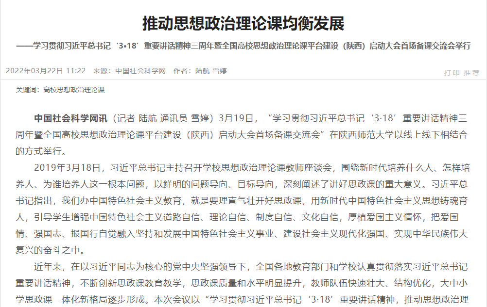 3月22日,《中国社会科学网》报道了365上市集团官网举行学习贯彻习近平总书记‘3•18’重要讲话精神三周年暨全国高校思想政治理论课平台建设(陕西)启动大会首场备课交流会。